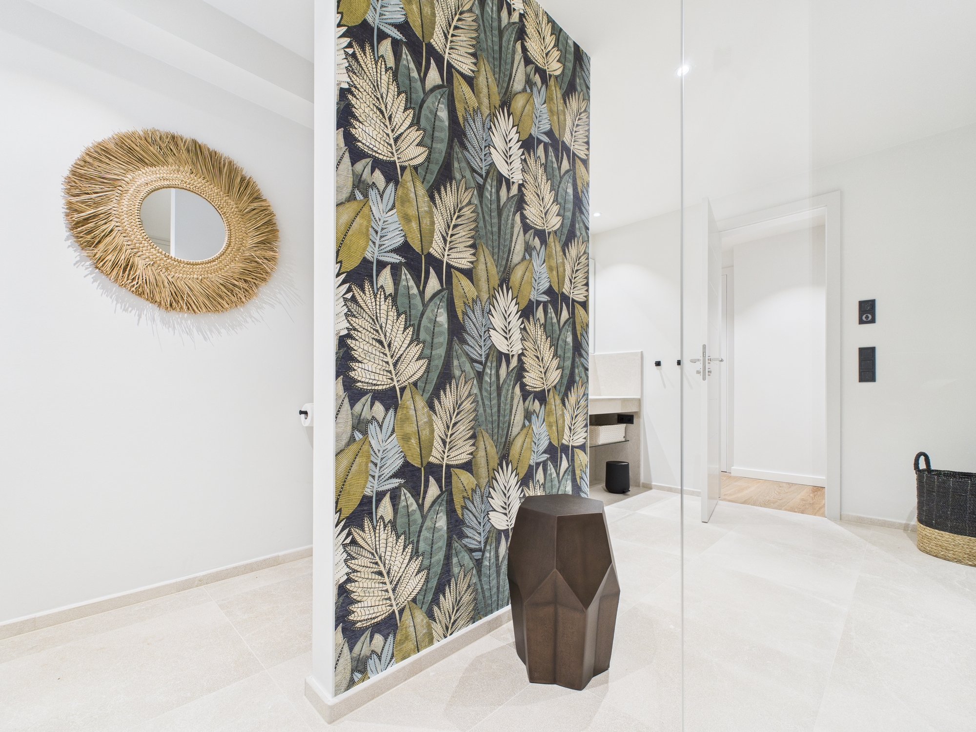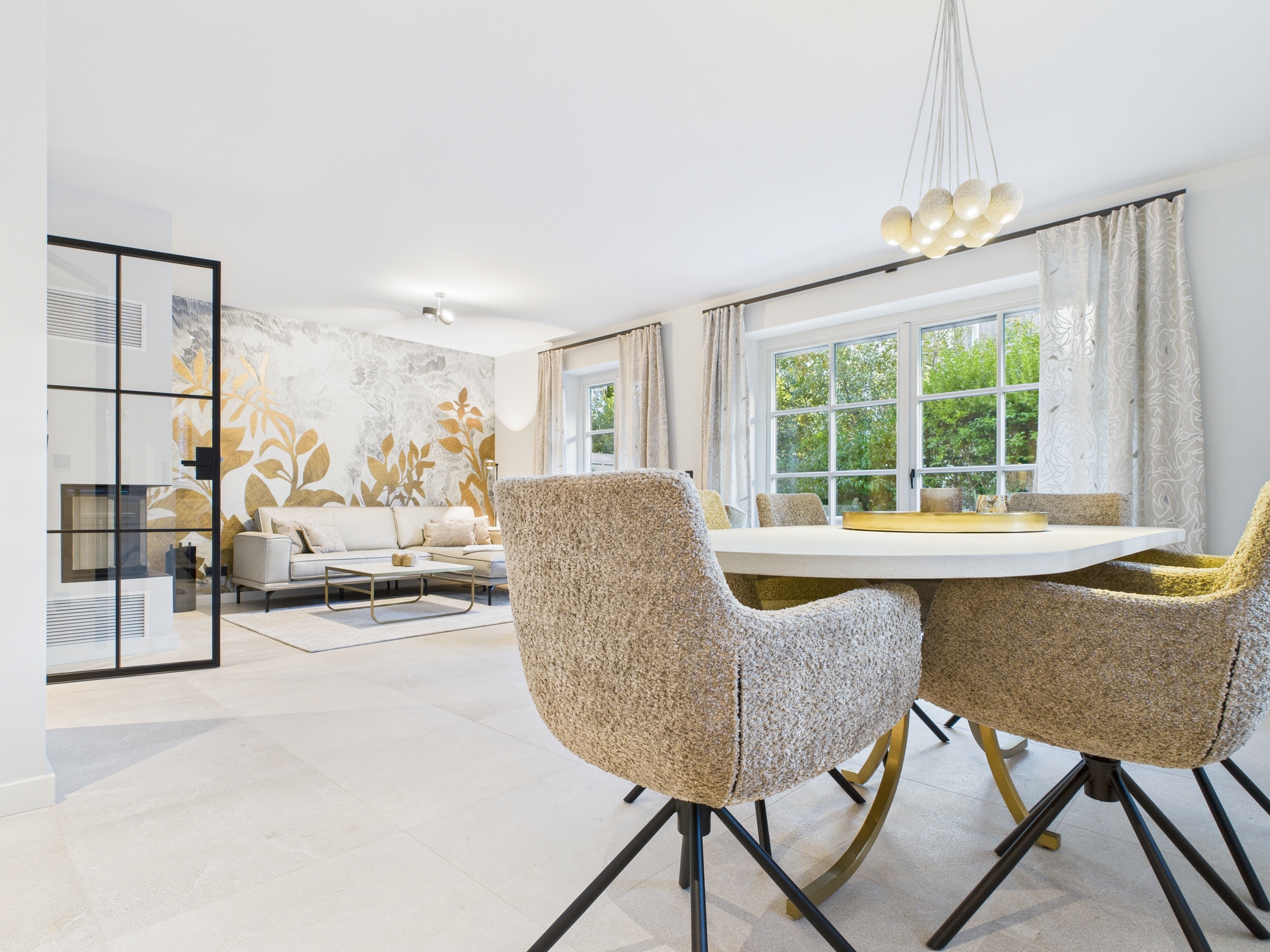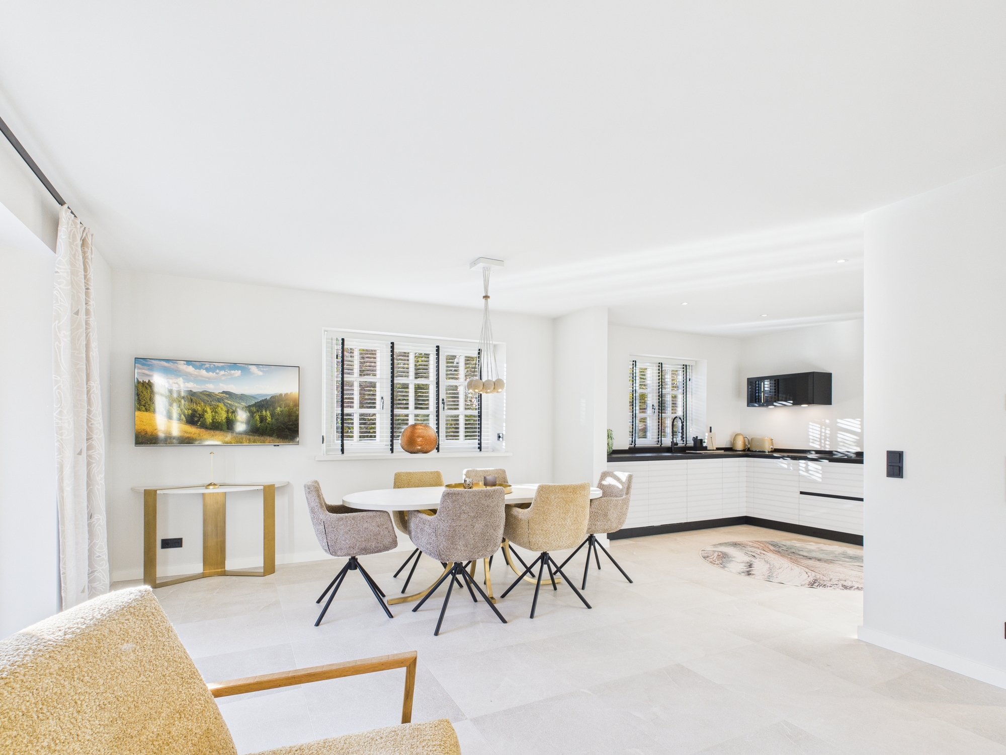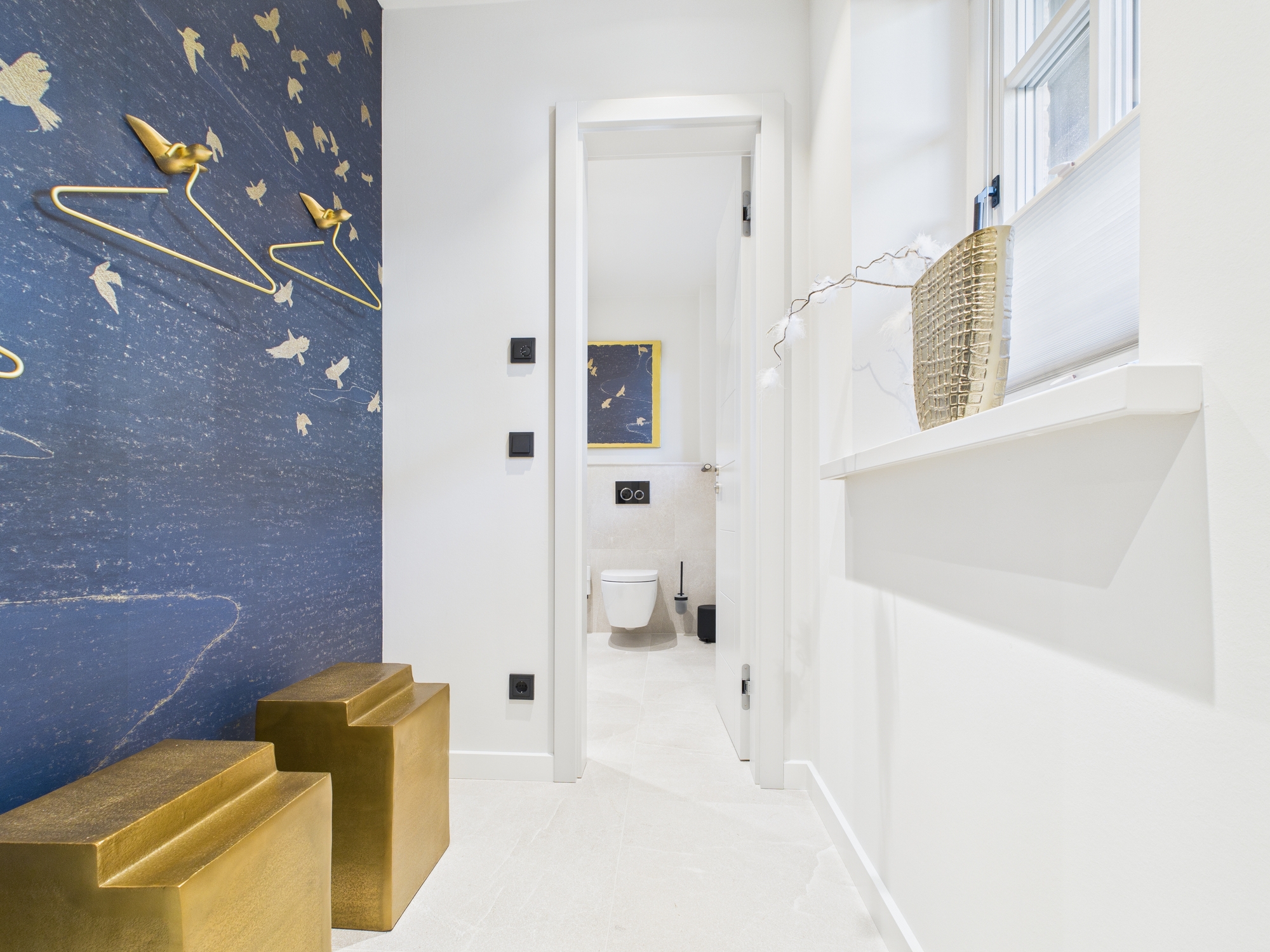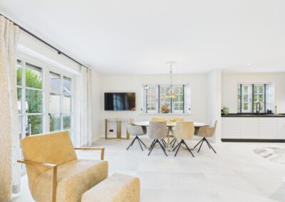 Schon die Diele empfängt mit einem durchdachten Gestaltungskonzept: helle Natursteinböden, moderne Wandgestaltung in tiefem Blau mit goldenen Akzenten und hochwertige Details, die einen stilvollen ersten Eindruck hinterlassen. Ein separates Gäste-WC ergänzt diese Ebene funktional. Der Wohn-, Ess- und Kochbereich öffnet sich mit über 40 m² Großzügigkeit und beeindruckender Helligkeit.
