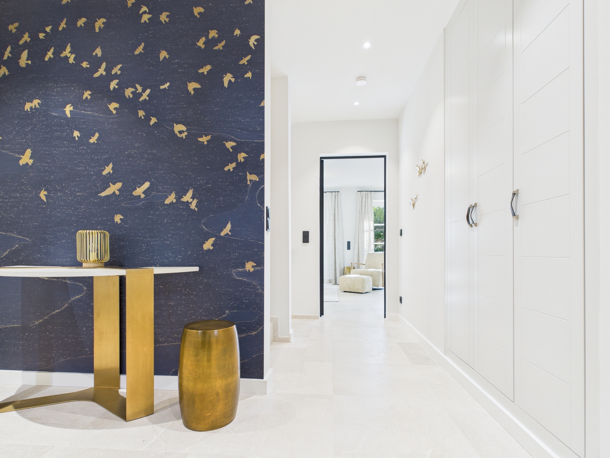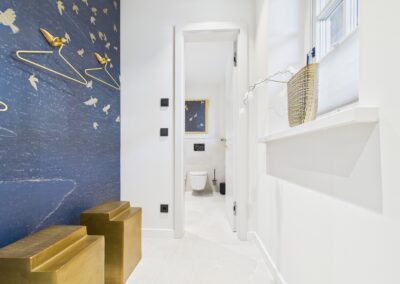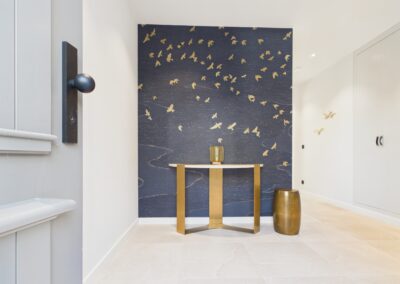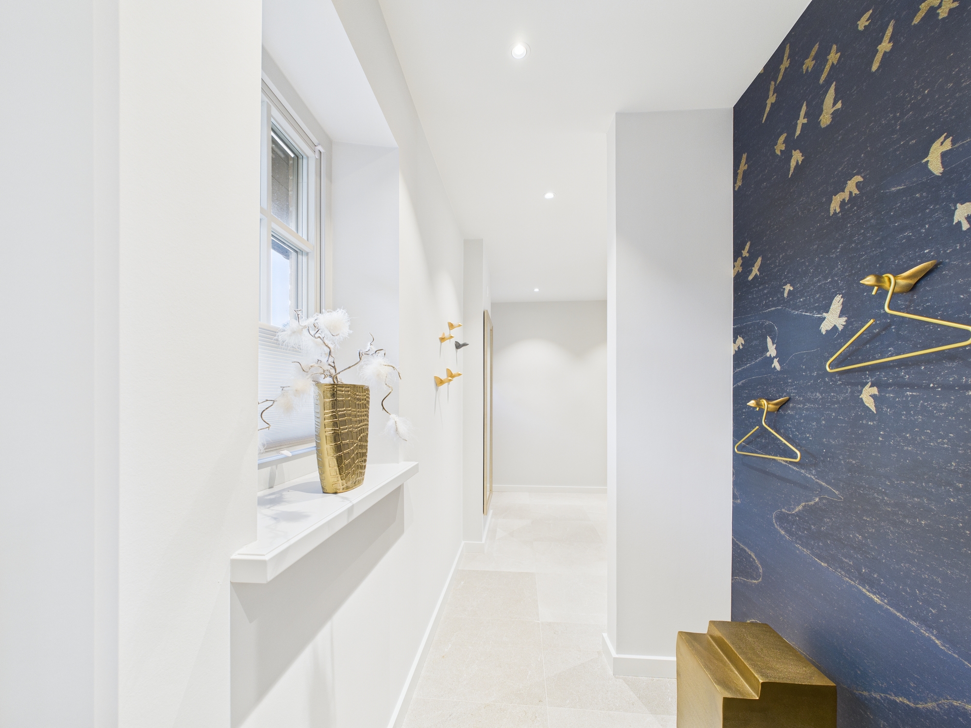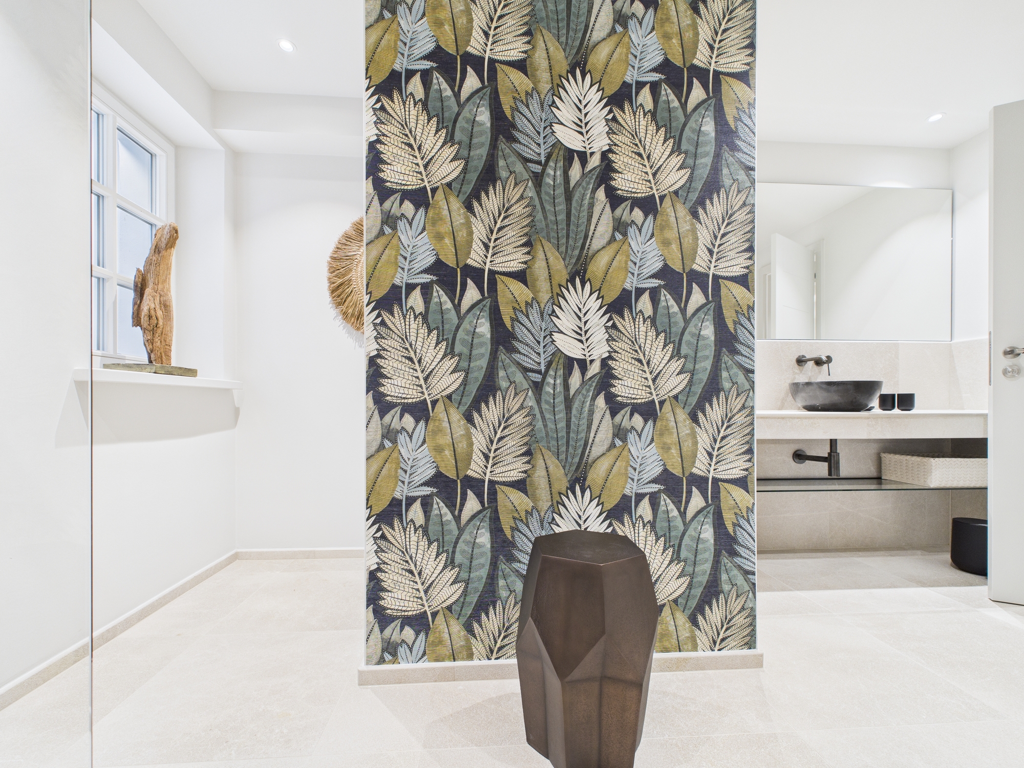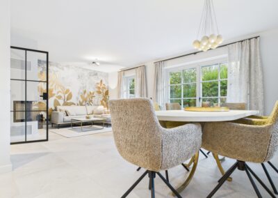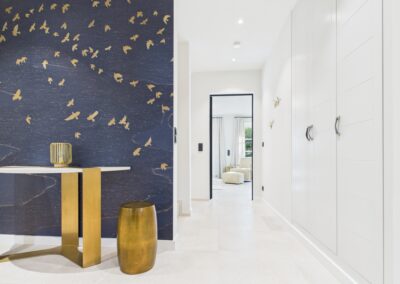 Schon die Diele empfängt mit einem durchdachten Gestaltungskonzept: helle Natursteinböden, moderne Wandgestaltung in tiefem Blau mit goldenen Akzenten und hochwertige Details, die einen stilvollen ersten Eindruck hinterlassen. Ein separates Gäste-WC ergänzt diese Ebene funktional. Der Wohn-, Ess- und Kochbereich öffnet sich mit über 40 m² Großzügigkeit und beeindruckender Helligkeit.