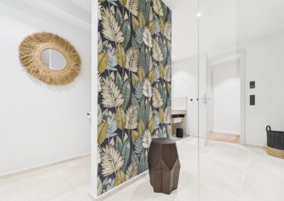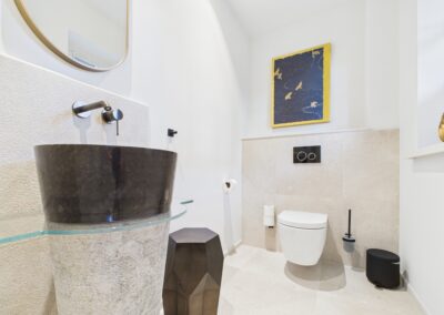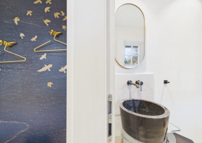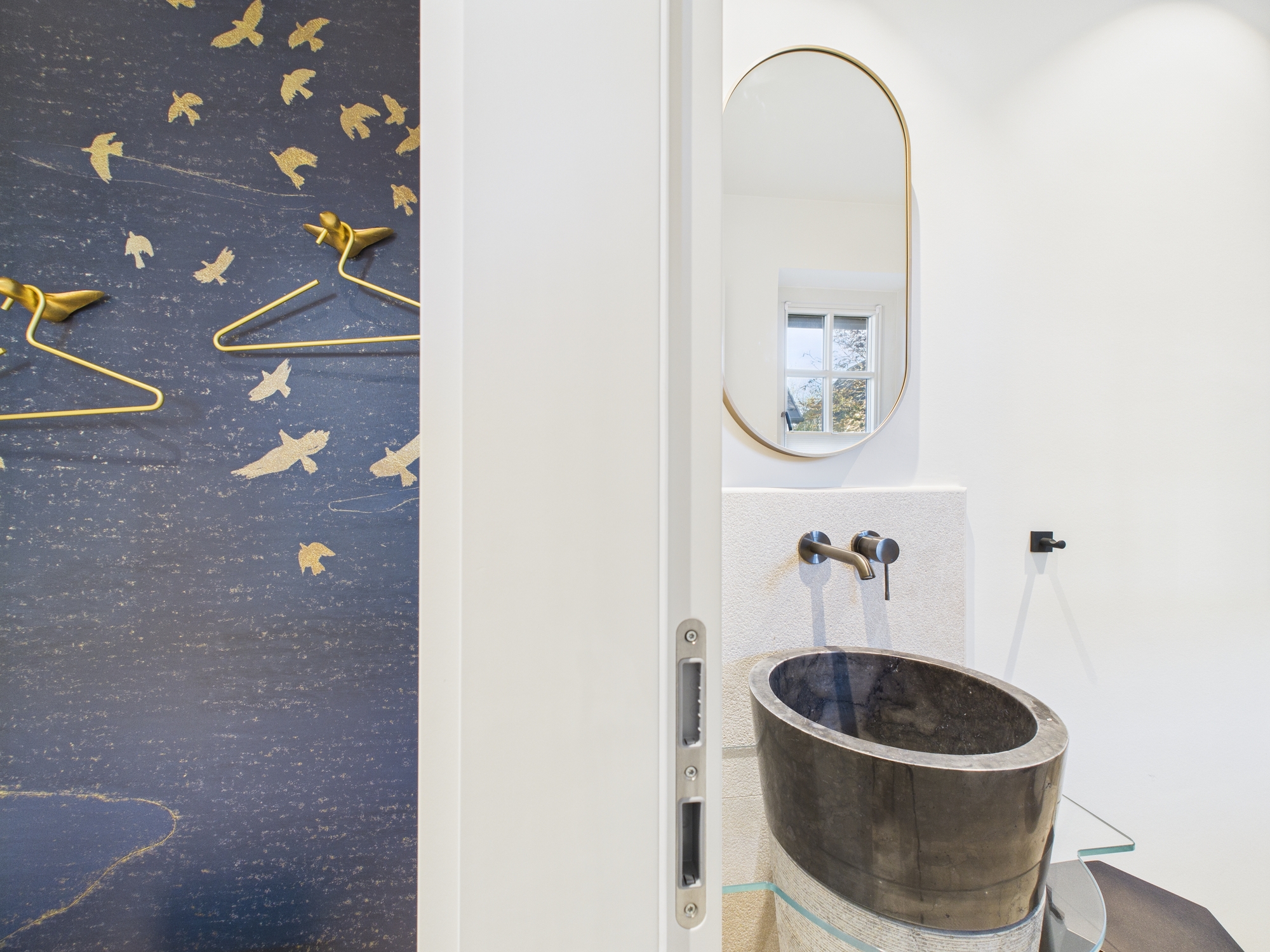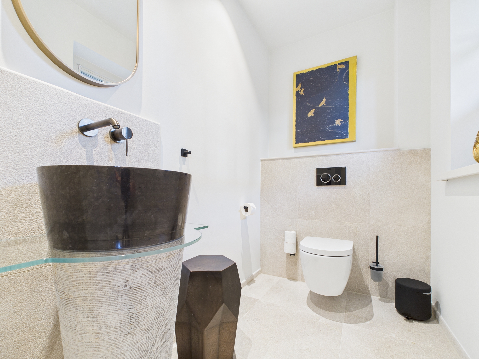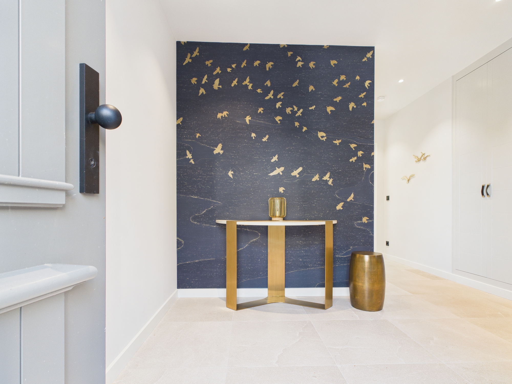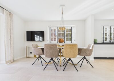 Schon die Diele empfängt mit einem durchdachten Gestaltungskonzept: helle Natursteinböden, moderne Wandgestaltung in tiefem Blau mit goldenen Akzenten und hochwertige Details, die einen stilvollen ersten Eindruck hinterlassen. Ein separates Gäste-WC ergänzt diese Ebene funktional. Der Wohn-, Ess- und Kochbereich öffnet sich mit über 40 m² Großzügigkeit und beeindruckender Helligkeit.