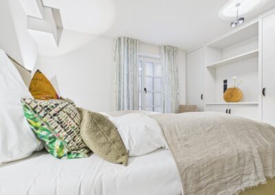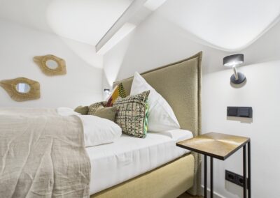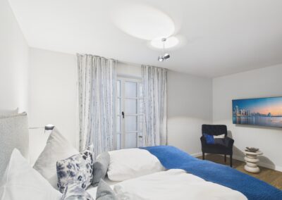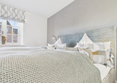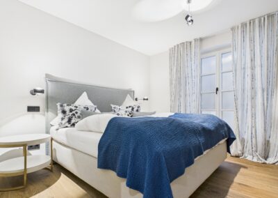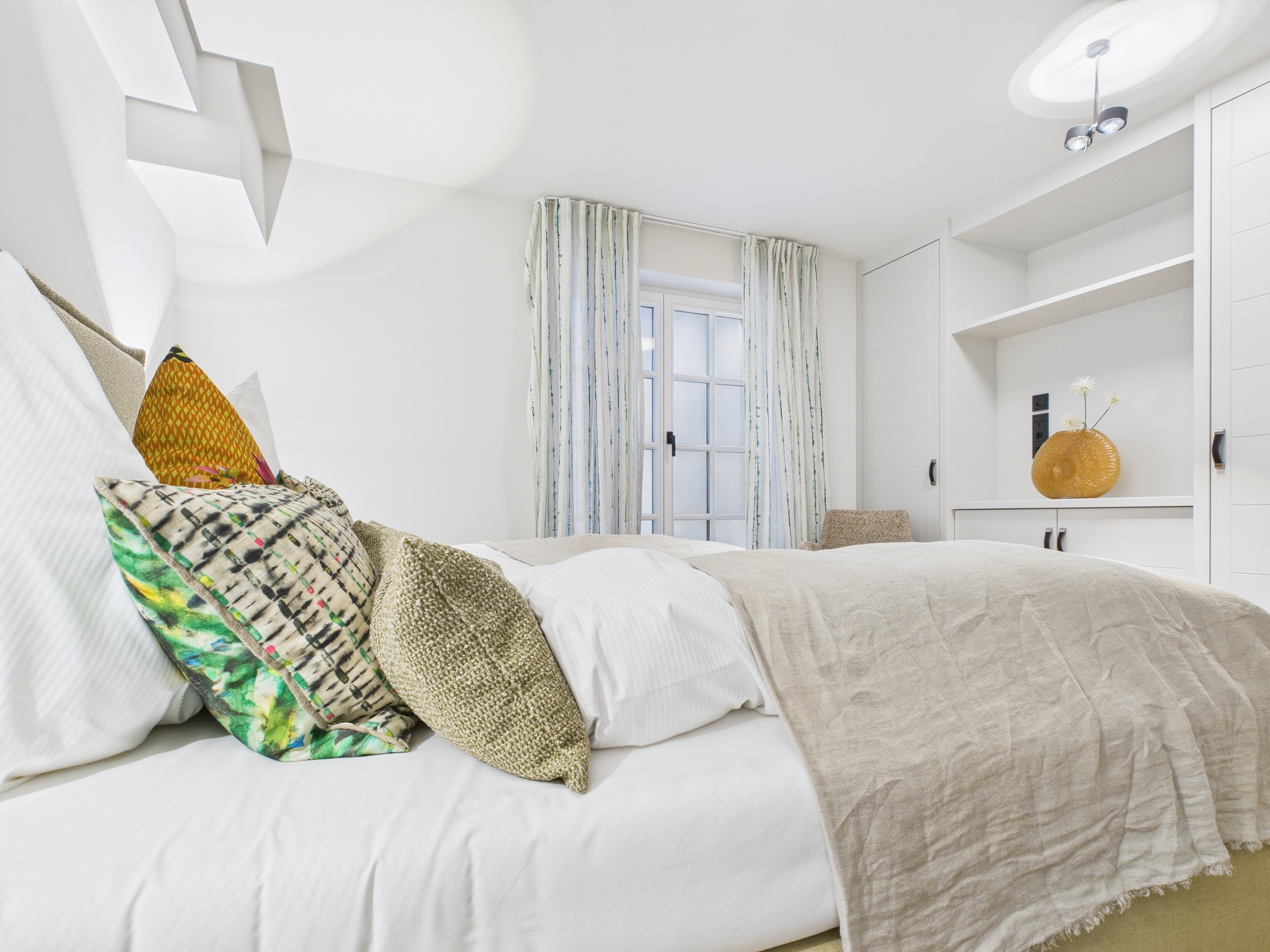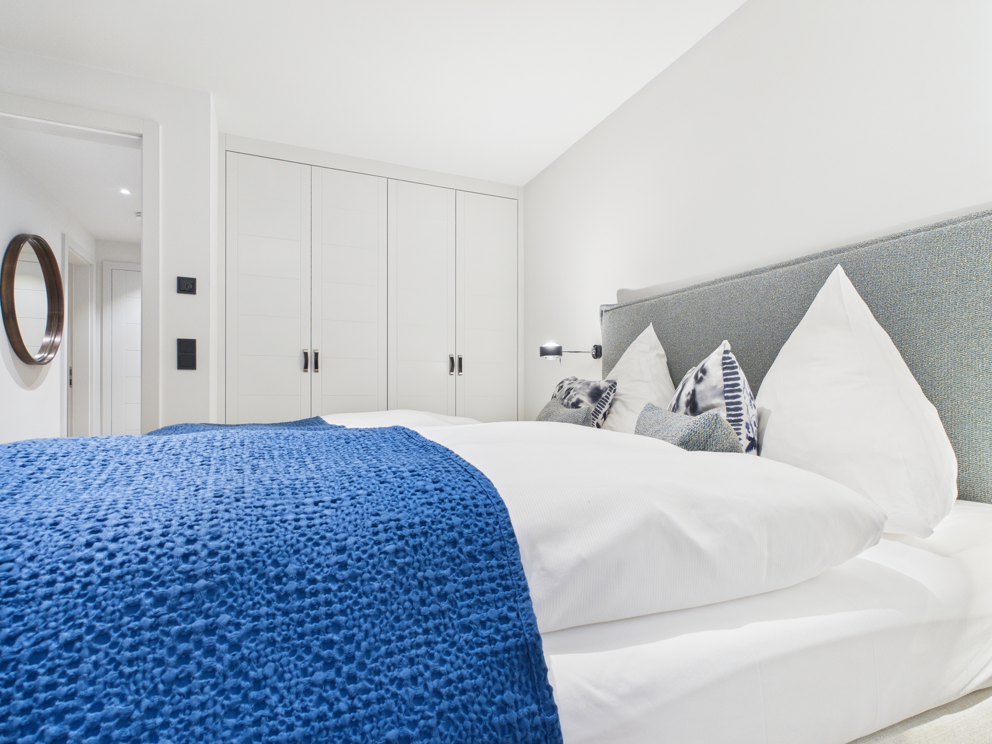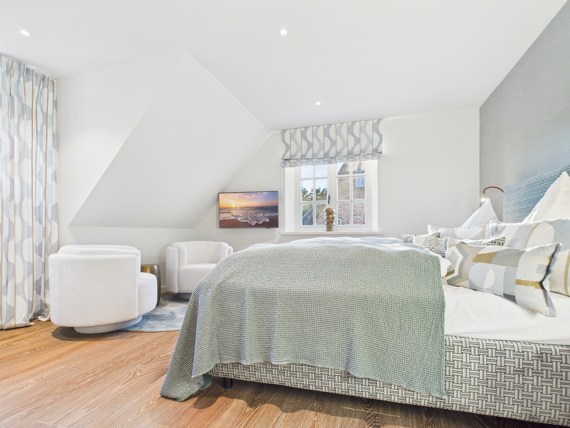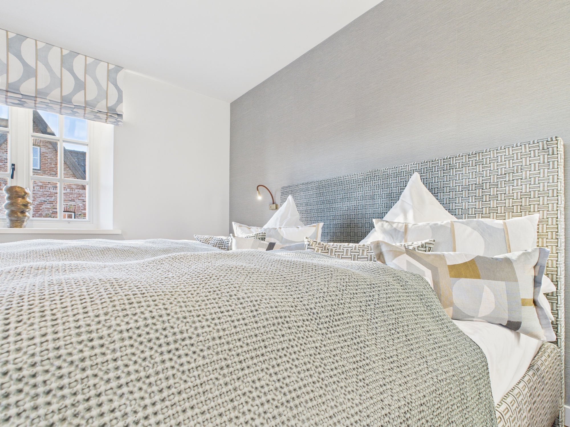 feinen Stoffauswahl und dem Blick ins Grüne hell und beruhigend. Die stimmige Möblierung – hochwertige Bettanlage,