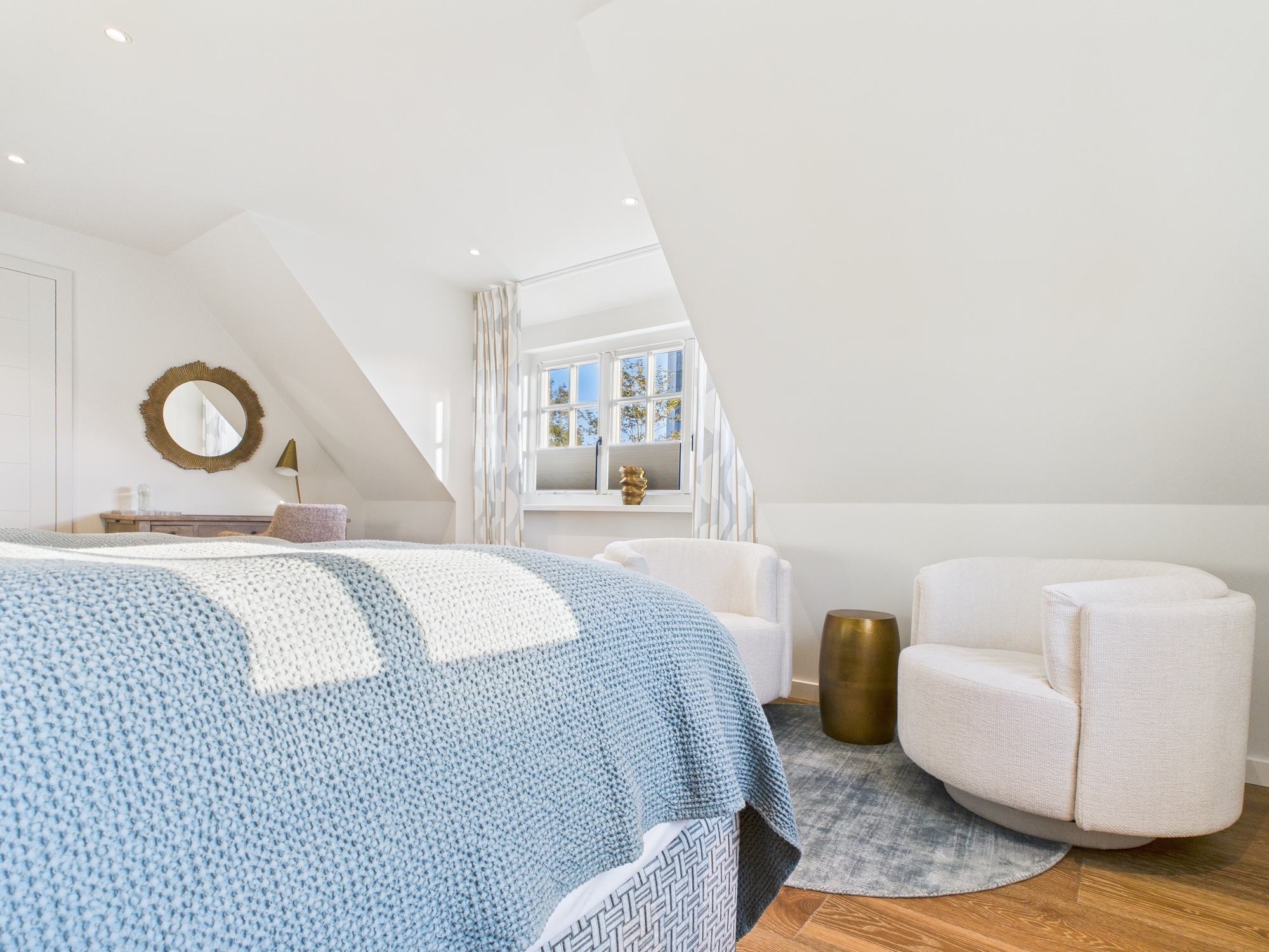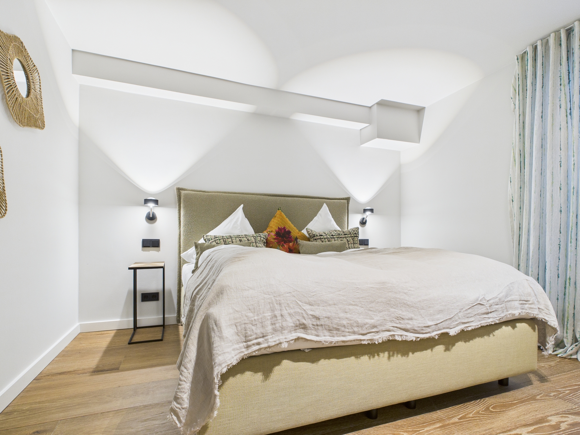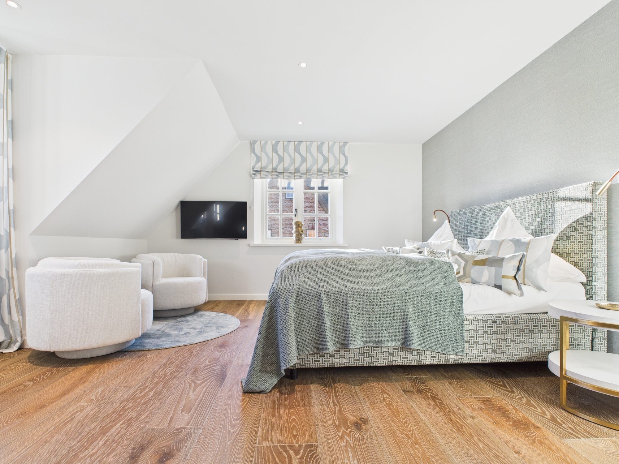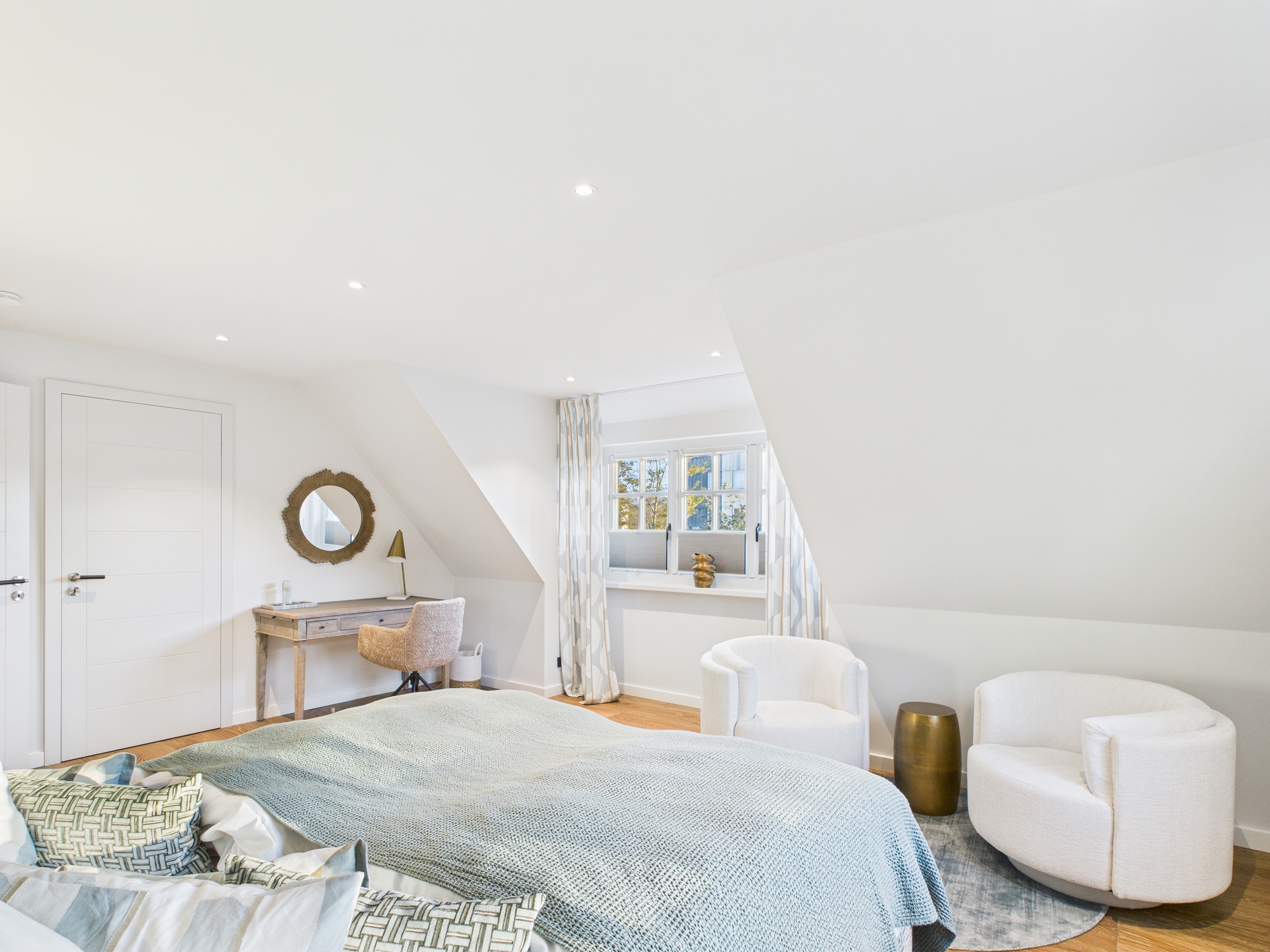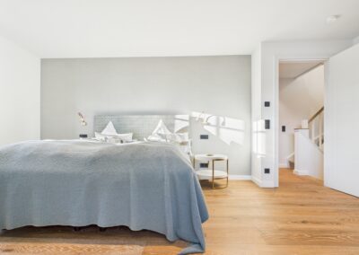 Das Obergeschoss präsentiert sich als private Komfortzone. Das Hauptschlafzimmer wirkt dank seiner klaren Linien, der
