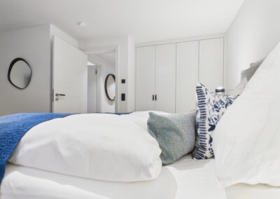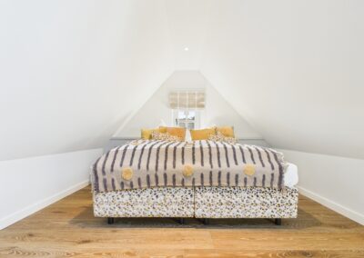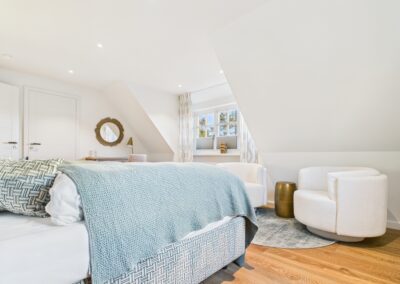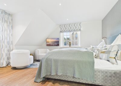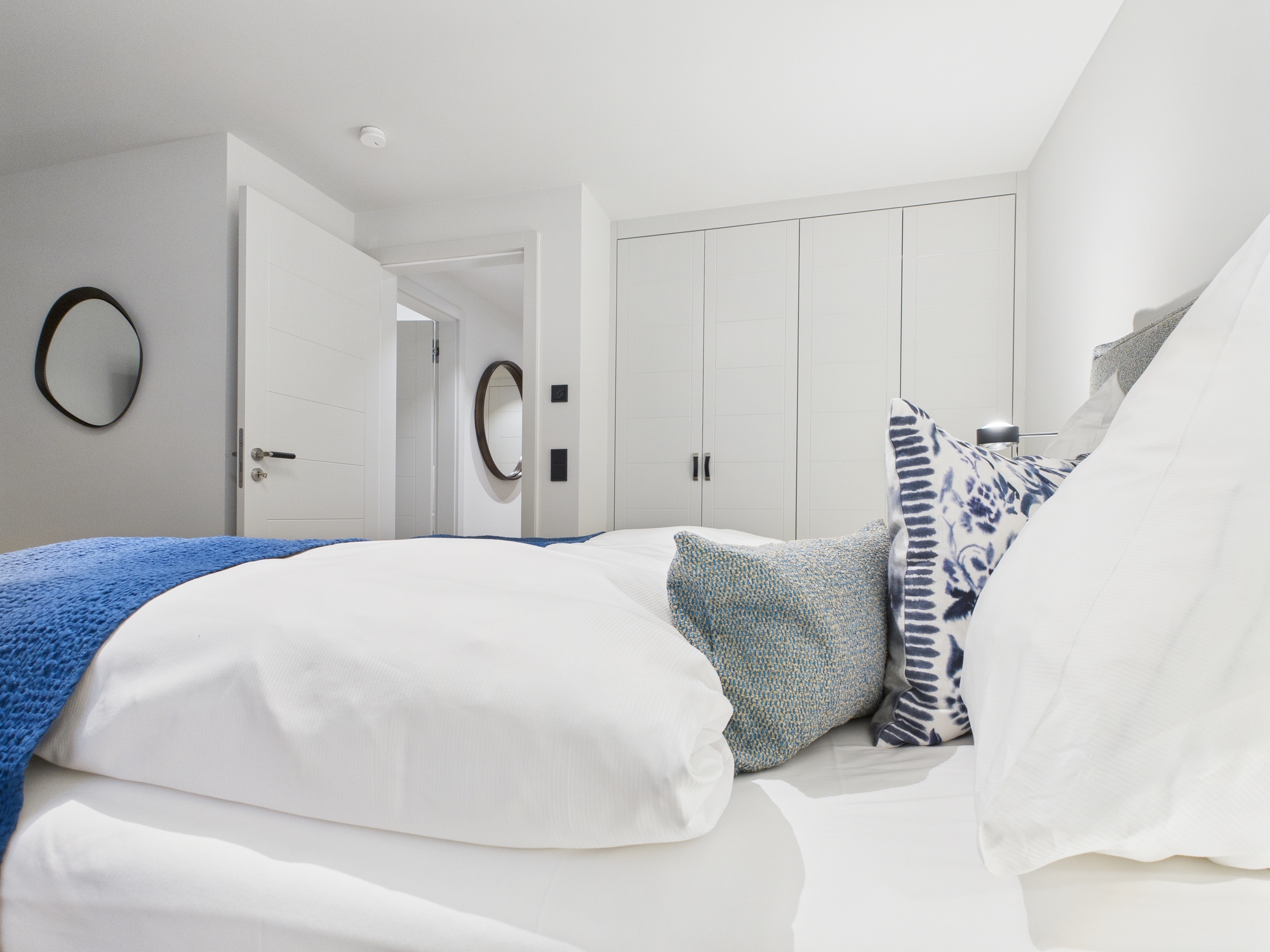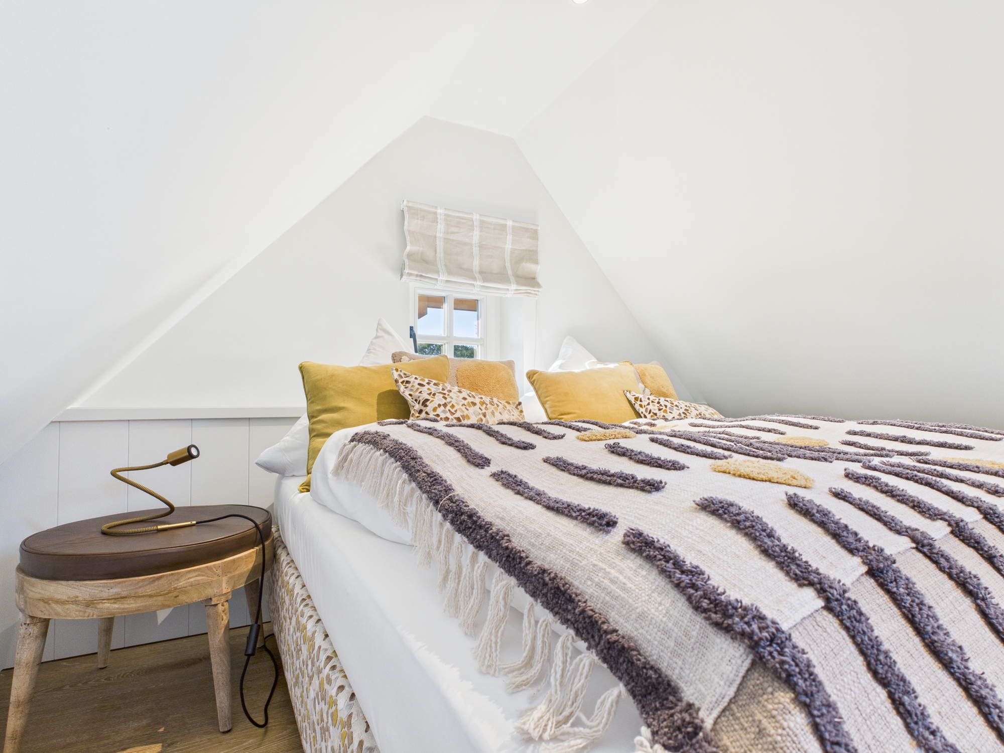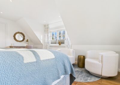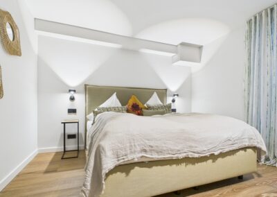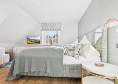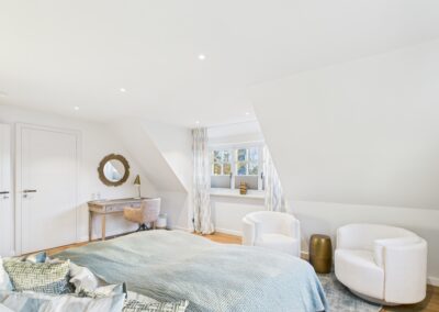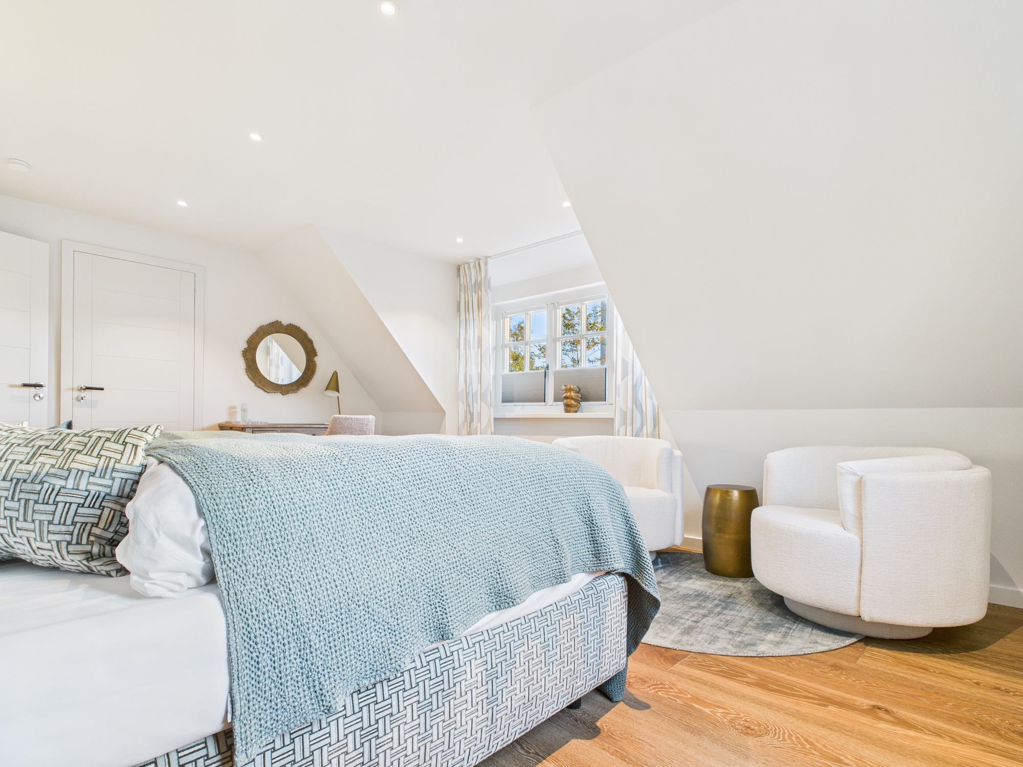 Das Obergeschoss präsentiert sich als private Komfortzone. Das Hauptschlafzimmer wirkt dank seiner klaren Linien, der