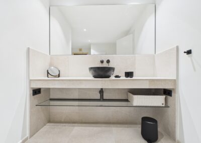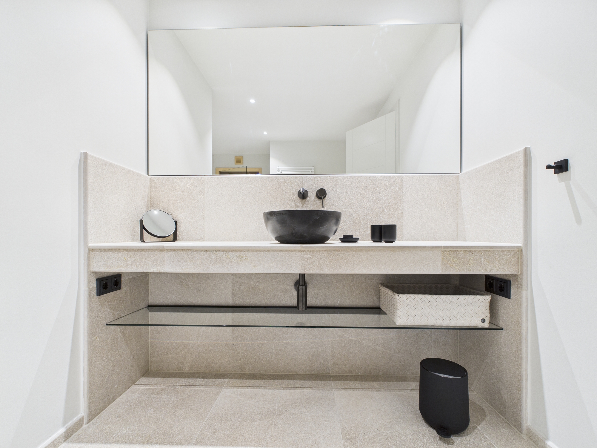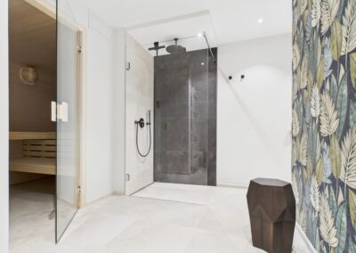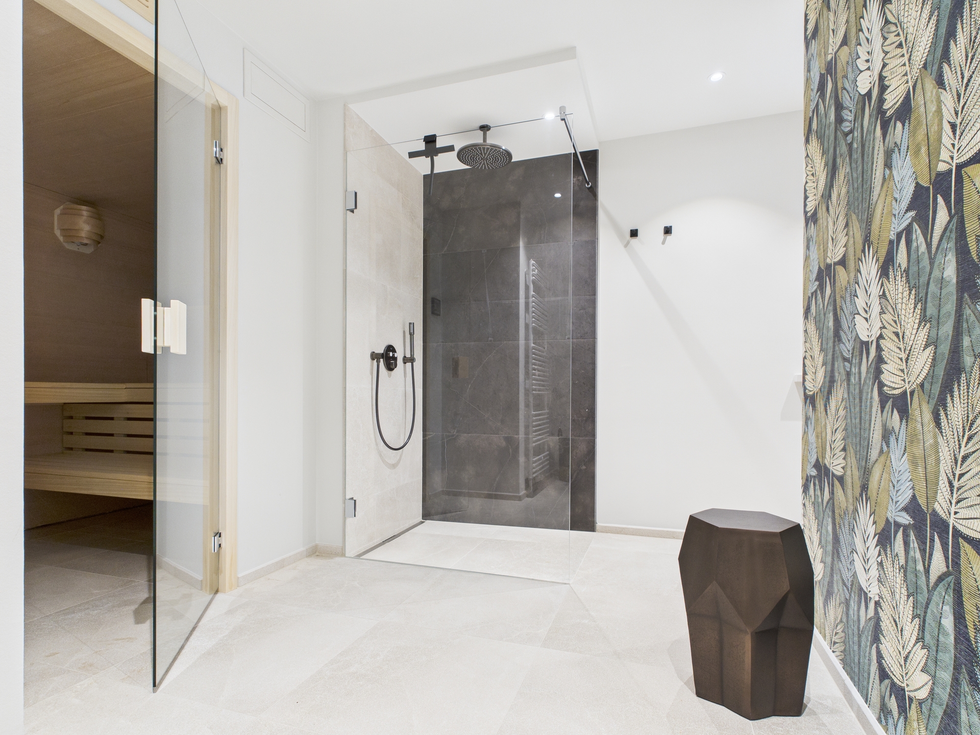 Naturtöne, eleganter Naturstein und moderne Armaturen verleihen diesem Raum eine wohltuende Spa-Atmosphäre.