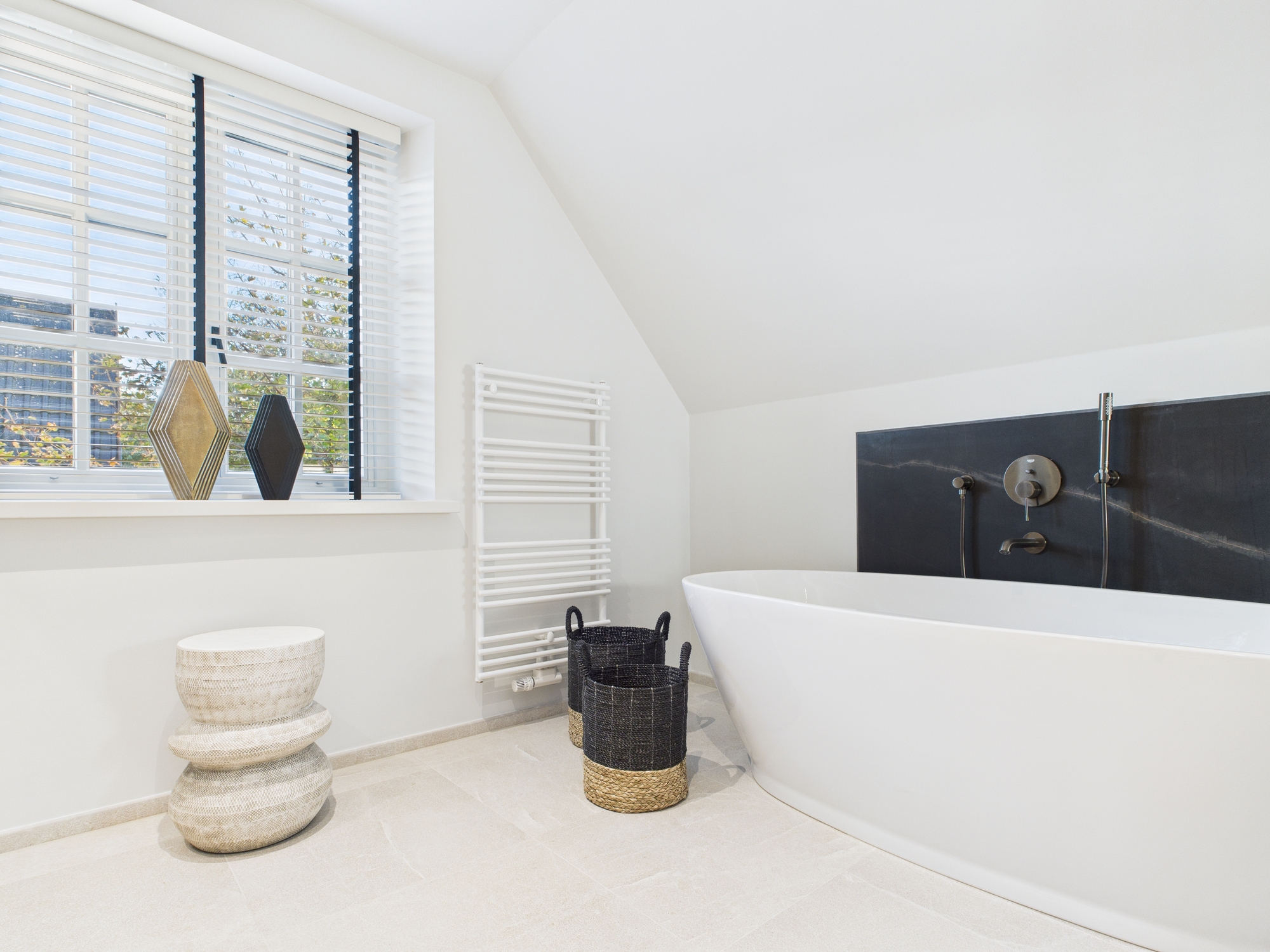 Das stilvoll ausgestattete Bad kombiniert eine großzügige Walk-in-Dusche mit einer freistehenden Badewanne. Dezente