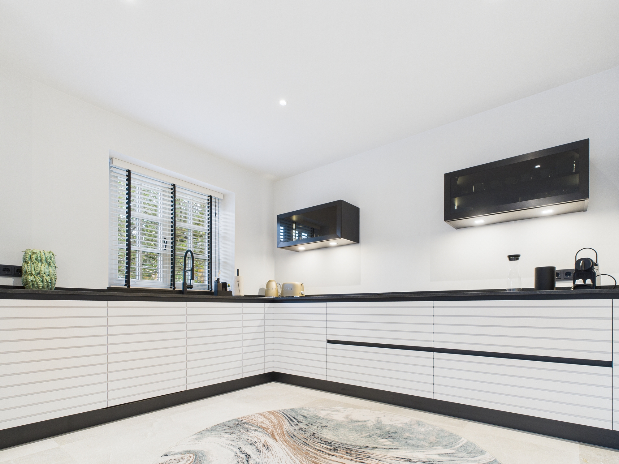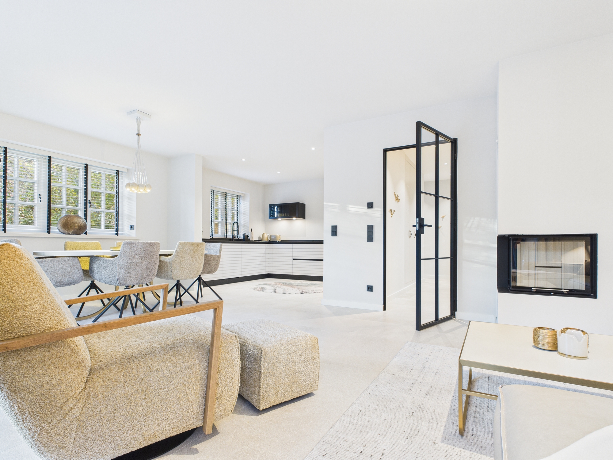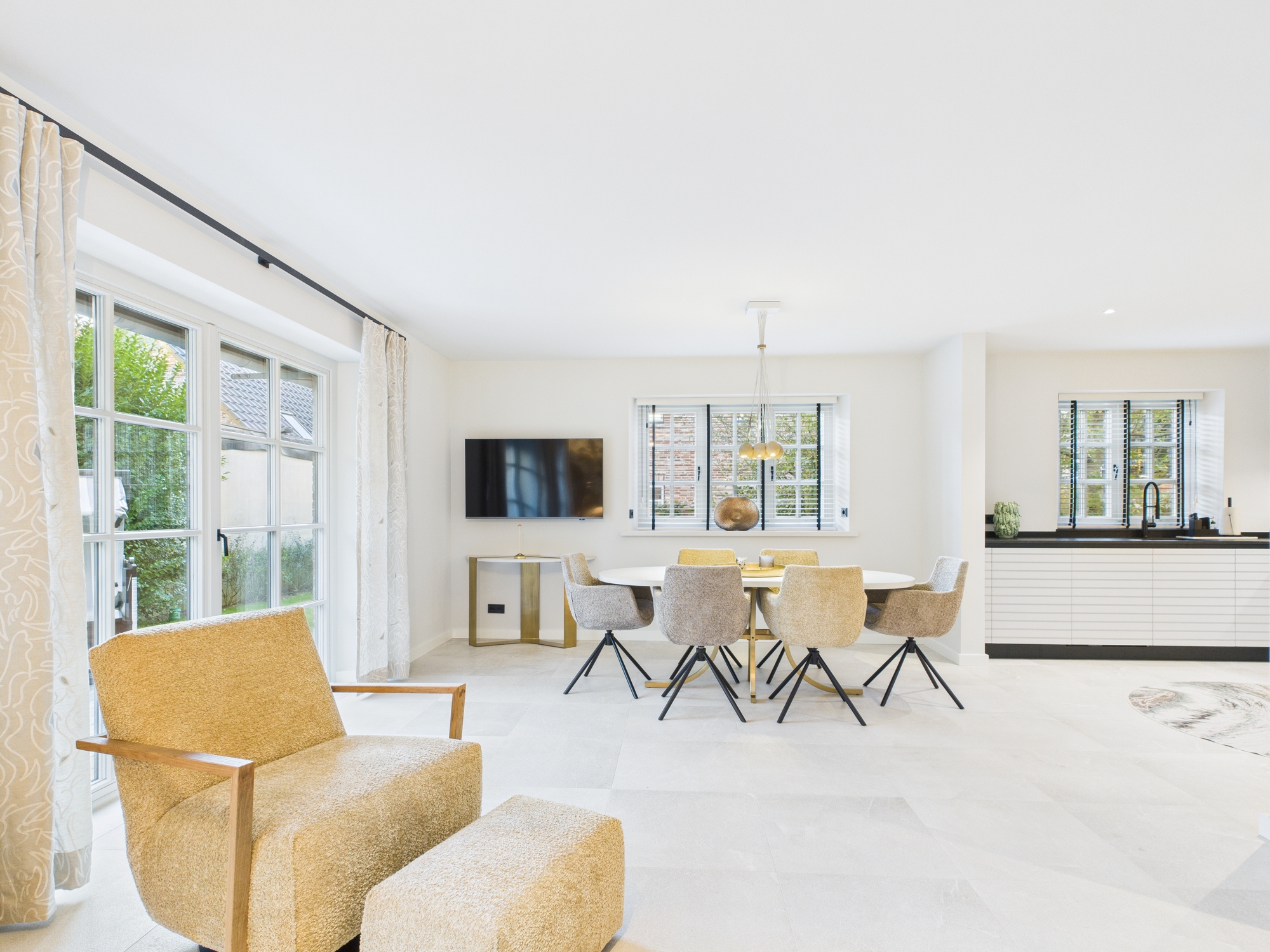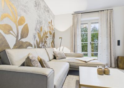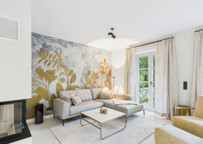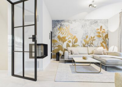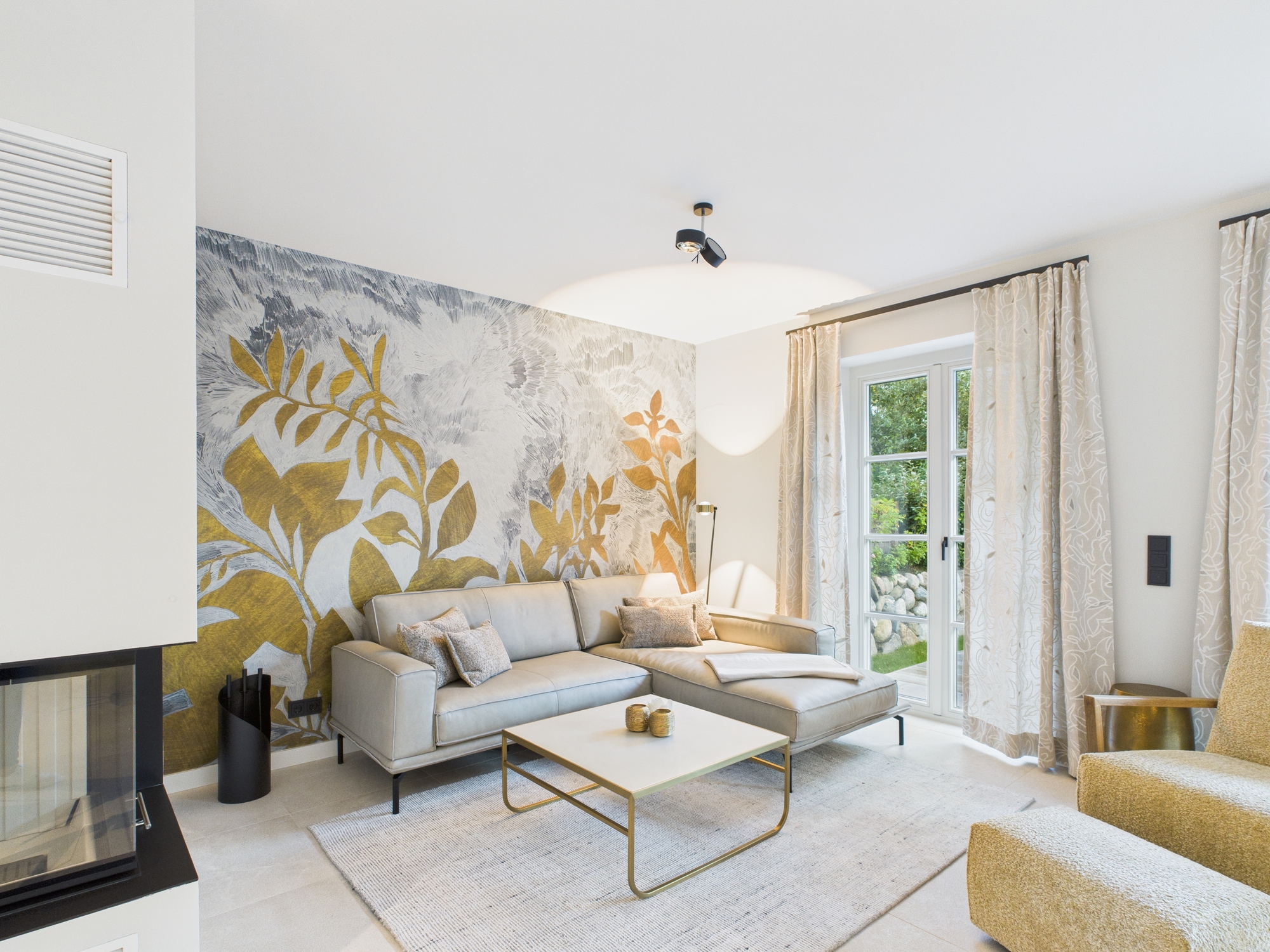 Die modern inszenierte Akzentwand im Wohnzimmer – ein florales Kunstmotiv in Gold- und Grautönen – setzt ein exklusives Highlight. Die elegante Glastrennwand Richtung Diele verleiht dem Raum eine architektonische Klarheit und schafft zugleich Transparenz und Leichtigkeit. Große Fensterfronten bringen viel Tageslicht hinein und öffnen den Blick Richtung Garten und Terrasse. Die hochwertig gestaltete Küche überzeugt mit klaren Linien, grifflosen Fronten und einer umfassenden Ausstattung – perfekt für genussvolle Abende und entspannte Urlaubsmomente. Der eingebaute Holzkamin sorgt an kühleren Tagen für wohlige Wärme und schafft eine Atmosphäre, die Ruhe und Geborgenheit ausstrahlt.
