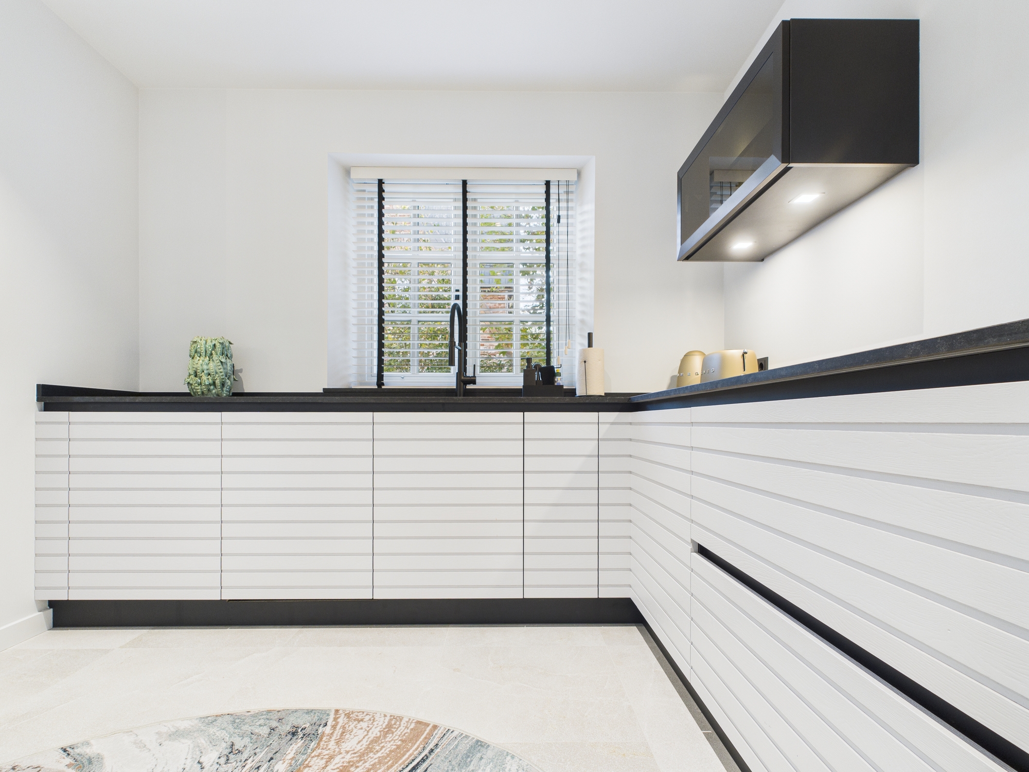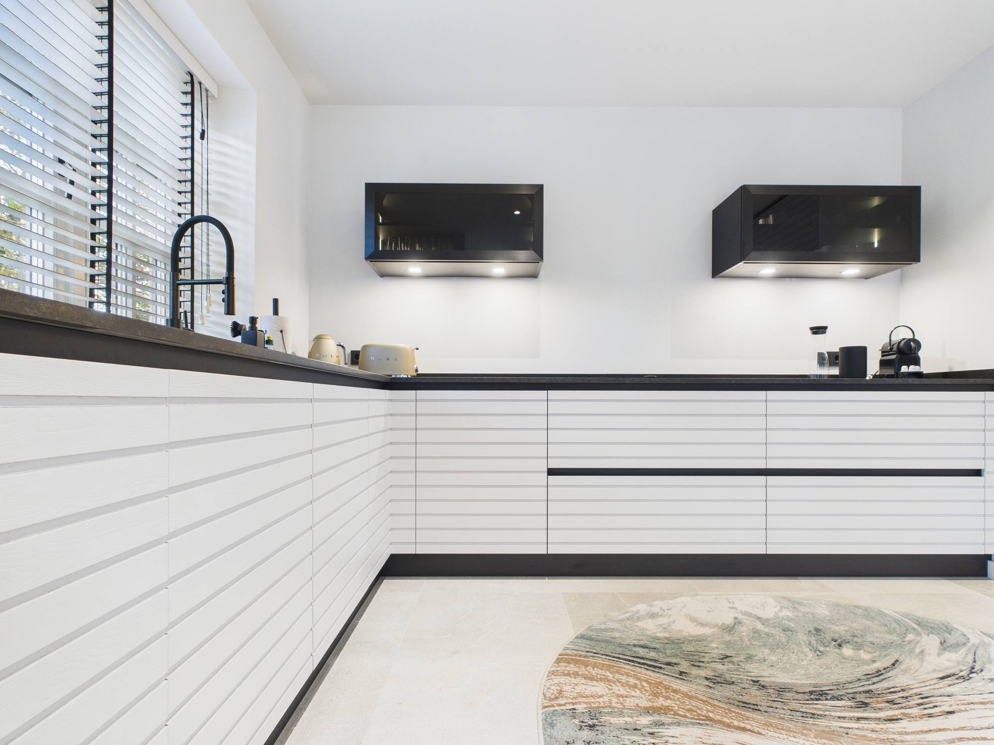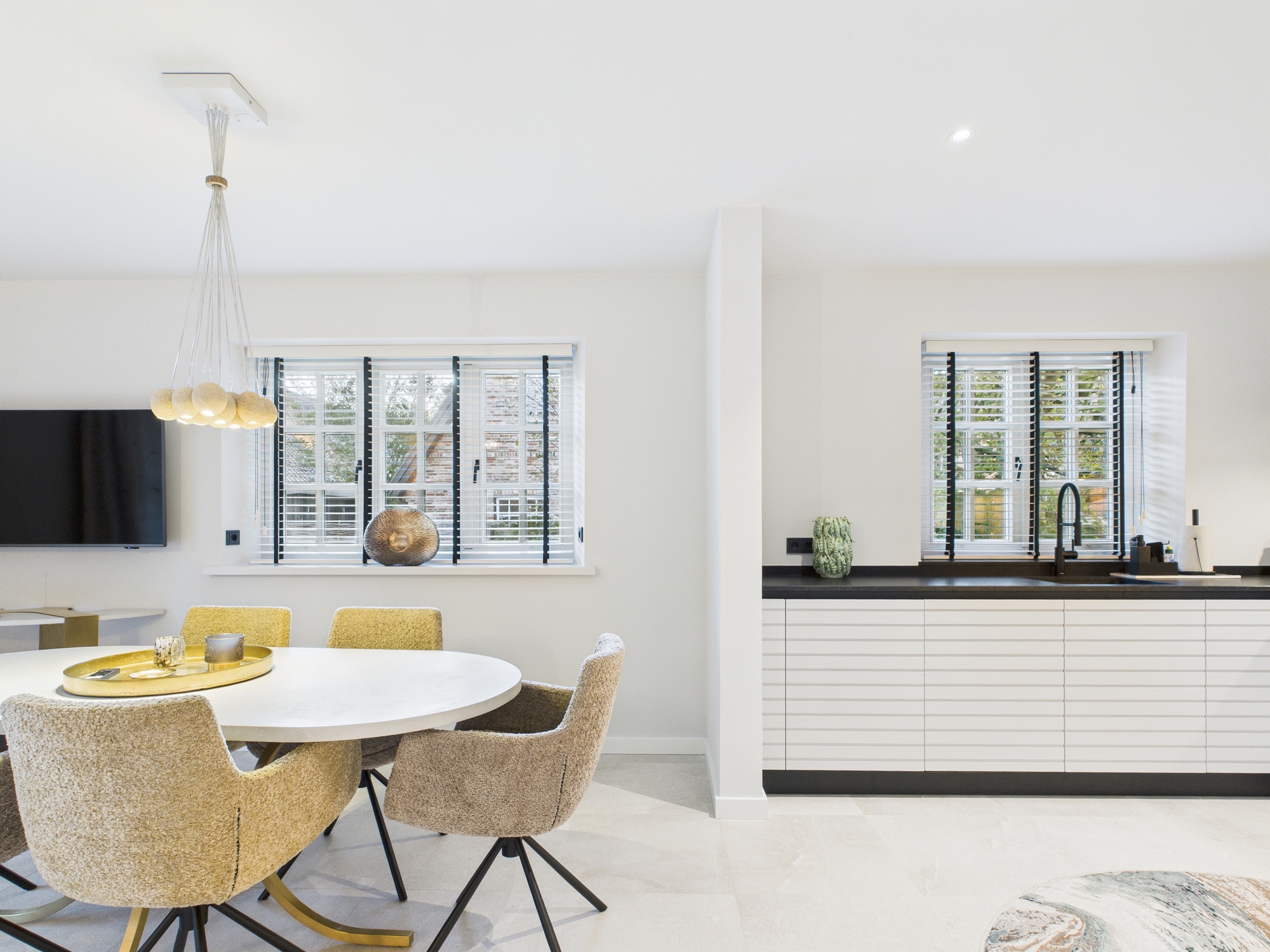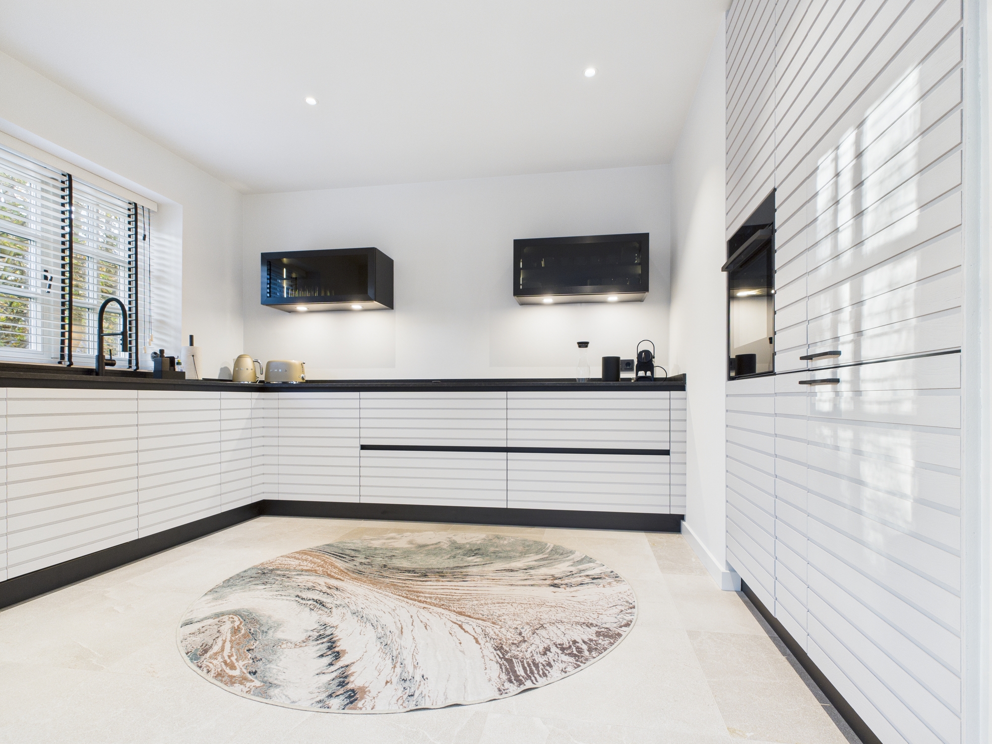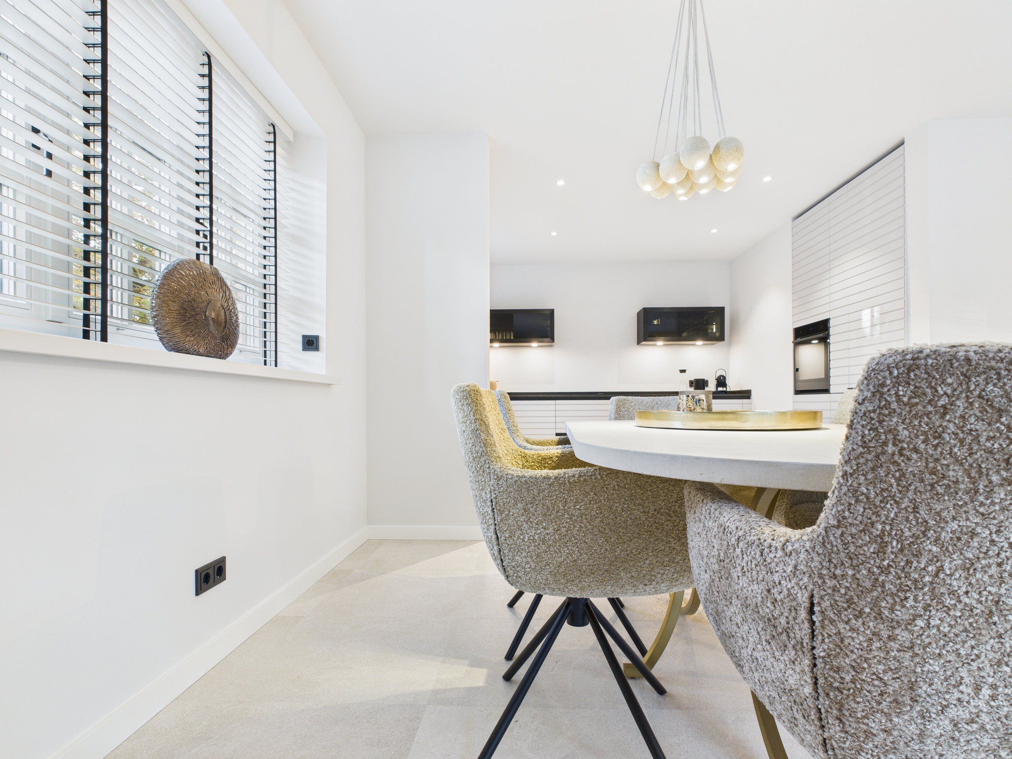 Die modern inszenierte Akzentwand im Wohnzimmer – ein florales Kunstmotiv in Gold- und Grautönen – setzt ein exklusives Highlight. Die elegante Glastrennwand Richtung Diele verleiht dem Raum eine architektonische Klarheit und schafft zugleich Transparenz und Leichtigkeit. Große Fensterfronten bringen viel Tageslicht hinein und öffnen den Blick Richtung Garten und Terrasse. Die hochwertig gestaltete Küche überzeugt mit klaren Linien, grifflosen Fronten und einer umfassenden Ausstattung – perfekt für genussvolle Abende und entspannte Urlaubsmomente. Der eingebaute Holzkamin sorgt an kühleren Tagen für wohlige Wärme und schafft eine Atmosphäre, die Ruhe und Geborgenheit ausstrahlt.